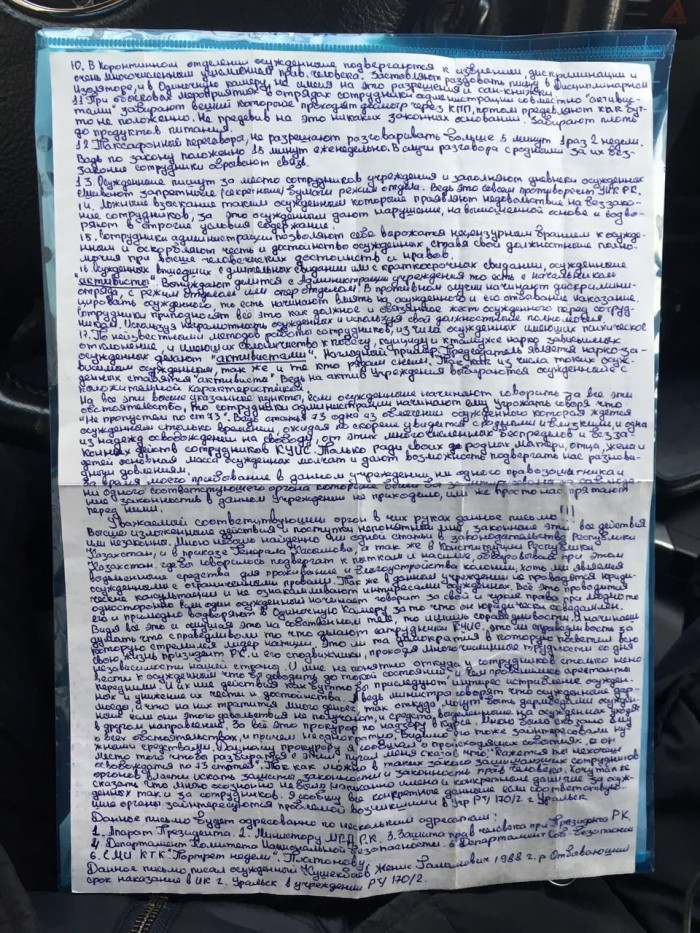 Женис Кушекбаев является заключенным уральской колонии РУ 170/2. В ноябре прошлого года парень написал письмо своей матери, с просьбой передать его правозащитникам. В письме говорилось о тюремном беспределе.